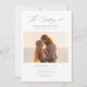 Erleben Sie das Wesen Ihrer Liebe mit unserem modernen Script Elegant Beach Wedding Foto Einladung. Diese doppelseitige Karte eignet sich ideal für eine Hochzeit am Meer oder am Strand. Sie besticht durch ein atemberaubendes Foto eines Paares, das sich bei Sonnenuntergang umarmt und die zeitlose Eleganz einer Baderomane verkörpert. Handgeschriebene Kalligraphie in Schwarz und Weiß fügt diesem trendigen, schicken Design eine Touch modernen Minimalismus hinzu. Ideal für informelle und stilvolle Hochzeiten im Sommer, verbindet diese Einladung zeitgenössische und klassische Elemente und ist somit die perfekte Wahl für eine traumhafte Feier an der Küste.