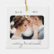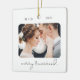 Dieses moderne Drehbuch Merry & Verheiratete Foto-Ornament beherbergt zwei Ihrer Hochzeitsfeiern auf der Vorder- und Rückseite, sowie Ihre Monogramme und das Datum Ihrer Feier. Dieser stilvolle Sake wird Sie an Ihren großen Tag für Jahrzehnte erinnern.
