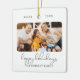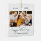 Dieses moderne Script Foto Happy Holidays Zierschmuck enthält zwei Ihrer Lieblings-Fotos (vorne und hinten) Ihrer Familie sowie Ihren Familiennamen und Ihr Datum. Platz für mehr Text auf der Rückseite.
