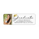 Moderne Abschluss Foto Rücksendeadressen-Aufkleber für die Einladungen, Ankündigungen oder Dankeschön-Karten Ihres Absolventen Ihrer High School oder Uni-AbsolventInnen mit einem handgeschriebenen Drehbuch-Typografie GRADUATE Titeldesign in schwarz Akzent mit einem Imitat Metallic Goldfolie Graduierdeckel oder Mörtel auf weißem Hintergrund. HILFE: Für Hilfe bei Designänderungen oder Personalisierungen, Farbänderungen, der Übertragung des Designs auf ein anderes Produkt oder der Koordination von Gegenständen, wenden Sie sich bitte an den Designer, bevor Sie über den Zazzle Chat MESSAGE Tab bestellen oder per E-Mail an makeitaboutyoustore@gmail.com.