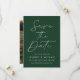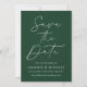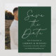 Verkünden Sie Ihre bevorstehende Hochzeit im Stil mit dieser trendigen Modern Script Green Foto Save the Date Karte! Das Design zeigt sich "Save the Date" in trendiger weißer Kalligrafie mit dunkelgrünem Hintergrund. Personalisieren Sie den Minimalisten Save the Date mit Ihren Namen, Hochzeitstag, Ort und Hochzeitswebsite. Save the Date kehrt sich um, um das Foto der vertikalen Verlobung mit dem vollen Blutdruck anzuzeigen. Das schicke Grün Save the Date die perfekte Wahl für moderne Hochzeiten.
