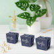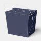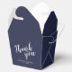 Moderne Script Navy Blue Gastgeschenk Hochzeit Geschenkboxen mit dem Wort 'Danke' in weißem, modernem Script Schriftart mit Namen und Datum in modernen Sans Serif Schriftart auf marineblau Hintergrund.