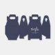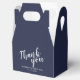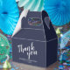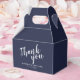 Moderne Script Navy Blue Gastgeschenk Hochzeit Geschenkboxen mit dem Wort 'Danke' in weißem, modernem Script Schriftart mit Namen und Datum in modernen Sans Serif Schriftart auf marineblau Hintergrund.