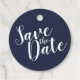 Moderne Script Nautical Navy Blue Wedding Save the Date Favor Tags enthält Titel in weißen modernen Skript-Schriftart auf marineblau Hintergrund.