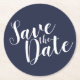 Moderne SkriptWedding Save the Date Paper Coasterfeatures Titel in weiß modernen Script-Schriftart auf marineblau Hintergrund.
