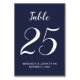 Moderne Script Navy Blue Wedding Tischnummer mit Titeln in weißem, modernem Script Schriftart mit Details in weißen modernen Sans Serif Schriftart auf marineblau Hintergrund.