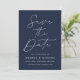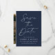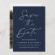 Verkünden Sie Ihre bevorstehende Hochzeit im Stil mit dieser trendigen Modern Script Navy Foto Save the Date Karte! Das Design zeigt "Save the Date" in trendiger weißer Kalligraphie mit mariniertem Hintergrund. Personalisieren Sie den Minimalisten Save the Date mit Ihren Namen, Hochzeitstag, Ort und Hochzeitswebsite. Save the Date kehrt sich um, um das Foto der vertikalen Verlobung mit dem vollen Blutdruck anzuzeigen. Die schicke Marine Save the Date die ideale Wahl für moderne Hochzeiten.