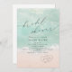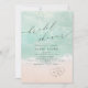 Schöne türkisfarbene abstrakte Aquarell glitzernde Ozeanwelle und Herzen im Hintergrund des Sandstrandes, mit stilvollem Drehbuch und eleganten Serif-Schriftart, modern und einfach. Grosse Einladung zum Hochzeitsduschen am Wasserstrand, tropische Hochzeit in Urlaubsort, Brautparty zum Thema Meeresküste im Sommer.