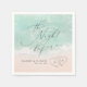 Schöne türkisfarbene abstrakte Aquarell glitzernde Ozeanwelle und Herzen im Hintergrund des Sandstrandes, mit stilvollem Drehbuch und eleganten Serif-Schriftart, modern und einfach. Die Nacht vor dem Servietten für das romantische Abendessen der modernen Probe, die Hochzeit des Seestrandes, die tropische Hochzeit in Urlaubsort, die Hochzeit des Küstenmeers im Sommer.