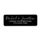 Modernes Script Black and White Wedding Return Label mit dem Namen von Braut und Bräutigam in elegantem Kalligraphie Schriftart und Adresse in modernen Sans Serif Schriftart Stil.