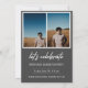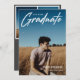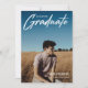 Modernes White Script "Graduate" Overlay, Ankündigung und Einladung von Foto Abschluss der Senior Class. Vorlagenzeilen für den Namen des Absolventen, die Klasse des Jahres und die Schule. Auf der Rückseite der Karte befinden sich 2 zusätzliche Fotos mit Textzeilen für die Details Ihrer Freihaus/Graduierungsparty auf grauem Hintergrund.