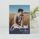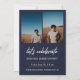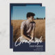 Modernes White Script "Graduate" Overlay, Ankündigung und Einladung des Foto Abschlusses in Marineblau. Vorlagenzeilen für den Namen des Absolventen, die Klasse des Jahres und die Schule. Auf der Rückseite der Karte befinden sich 2 zusätzliche Fotos mit Textzeilen für die Details Ihrer offenen Haus/Graduierungsparty.