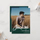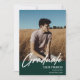 Modernes, weißes Skript "Graduate" Overlay, Ankündigung des Abschlusses der Senior Class und Einladung in grün. Vorlagenzeilen für den Namen des Absolventen, die Klasse des Jahres und die Schule. Auf der Rückseite der Karte befinden sich 2 zusätzliche Fotos mit Textzeilen für die Details Ihrer offenen Haus/Graduierungsparty.