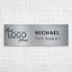 Modernes Namensschild mit Ihrem Firmenlogo vor einem silbernen Imitat mit metallischem Hintergrund. Fügen Sie einen Namen und Titel in einfacher Typografie hinzu.