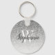 Dieser schicke Keyring ist mit einem silberfarbenen Imitat Glitzer Hintergrund ausgestattet. Passen Sie es an mit Ihrem anfänglichen Schriftart in der weißen Serife und Ihrem Namen in dunkelgrauem Pinselskript im handgeschriebenen Stil.