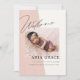 Mit dieser modernen Geburtsankündigung für Mädchen kündigen Sie Ihre süße Ankunft an. Es ist mit einem Farbstreifen in Rosa und dem Wort "willkommen" in einem modernen Drehbuch ausgestattet. Fügen Sie einen Vornamen, Zweitnamen, Maße, Geburtsdatum und Namen der Eltern auf dieser modernen Geburtsankündigungskarte hinzu. Die Rückseite der Karte kann auch bearbeitet werden.