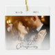 Dieses moderne Drehbuch OUR ERSTE CHRISTMAS Foto Ornament umfasst zwei Ihrer Verlobung oder Hochzeit Fotos (auf der Vorder- und Rückseite) sowie Ihre Monogramme und das Datum Ihrer Feier. Dieser stilvolle Sake wird Sie an den Tag erinnern, an dem Sie JA für Jahrzehnte gesagt haben.