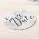 Moderne Schrift Hochzeit Speichern Sie den Date Paper Coasterfeatures Titel in grau modernen Drehbuch-Schriftart auf weißem Marmor Hintergrund.