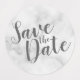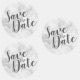 Modernes Script Save the Date Labels mit dem Titel "Save the Date" in grauem, modernem Script-Schriftart auf weißem Marmorhintergrund.