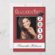 Anfangskappe sitzt auf kundenspezifischem Abschlussdatum. Laden Sie Ihr Highschool oder Unibild und personifizieren Sie Ihren Namen auf der Front. Füllen Sie Sie Partydetails über die Rückseite aus. Gezeigt im Rot, Schwarzweiss von den Papierausdrücken.