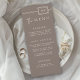 Das elegante Hochzeitsmenü ist Teil einer koordinierten Hochzeitskollektion mit den Monogramm-Initialen der Braut und des Bräutigams, die in einem doppelzeiligen Quadrat an der Spitze des Designs gerahmt sind. Es hat ein elegantes minimalistisches Layout und eine elegante Typografie, die den perfekten Ton für Ihre Feier bildet. Vollständig anpassbar mit Ihren Monogramm-Initialen und ausgewählten Menüpunkten für Ihren Hochzeitsempfang. Wenn Sie Text verschieben, Textzeilen hinzufügen oder löschen möchten, wählen Sie am unteren Ende der Entwurfsvorlage die Option "Bearbeiten mit dem Entwurfstool". Dies öffnet den gesamten Editor und ermöglicht Ihnen detailliertere Editierungen.