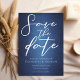 Schöne dunkelblaue Farbtöne schaffen eine Textur wie Wasser auf diesem Abend Save the Date Karte. Perfekt am See oder am Wasser lädt zu einer Zeremonie am See mit Blick auf das Wasser ein. Elegantes, weißes, minimalistisches Skript mit Ihren Details über einen Verlauf, der sich anfühlt, als ob Sie unter Wasser schwimmen.