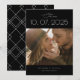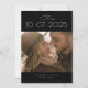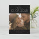 Eine moderne Save the Date-Karte, die sich auf das Datum in großen, fetten Zahlen vor einem schwarzen Hintergrund konzentriert, hat eine Kluft aus Kalligrafie und trendiger Topographie-Skript, die genau die Nuance, die benötigt wird, hinzufügt. Passen Sie den Namen, das Datum, den Ort und das Foto einfach an, um es zu Ihrem eigenen.