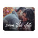 Modernes Foto speichert den Datums-Magneten mit dem horizontalen Vollblutbild mit einem Textüberlagerungssystem. Die Wörter "Save the Date" sind in einem Schriftart für die Handschrift eines weißen Pinselskriptes enthalten. Ein schlichtes und dennoch elegantes Design, das Ihr Foto zum Hauptmerkmal macht.