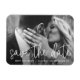 Modernes Foto speichert den Datums-Magneten mit dem kompletten blutenden horizontalen Bild mit einem Typografie-Overlay mit den Worten "Save the Date" in einem dünnen Schriftart mit weißer Schrift. Unten ist eine Zeile Text für Ihre Hochzeitsdetails. Ein schlichtes und dennoch elegantes Design, das Ihr Foto zum Hauptmerkmal macht.