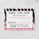 Modische Zebra-u. Gepard-Salon-Verkaufs-Zertifikate. Moderne hoch entwickelte Designer-Zebra-u. Gepard-Salon-Geschenkgutscheine. Stehen Sie heraus von der Menge u. geben Sie eine Erklärung mit diesen fördernden Karten des Geschäfts ab. Fertigen Sie mit Ihren persönlichen oder Geschäftsinformationen besonders an und führen Sie Ihre noble, moderne Seite mit diesen modernen u. sophisticted Geschenkgutscheinen vor. Ein großes Werkzeug, zum Ihres Geschäfts für Ihren Salon oder Wellness-Center zu erhöhen! Trendy und cool, dennoch elegant verfeinert mit Schwarzweiss-Zebrastreifen, die einen subtilen rosa Cheetahdruck halten. Ihr Handelsname kann auf die weiße Fahne mitten in diesen Karten gesetzt werden und Sie können die Rückseite vollständig besonders anfertigen mit Ihren Verkaufsdetails! Geschaffen und schützen Sie 2010 Julie Farrell urheberrechtlich, der, niedliches funky ist u. cooles Kleid und die Geschenke, die an glücklichem Einkaufen www.zazzle.com/jfarrell12 verfügbar sind. © 2010% pipe% Julie farrell | alle Rechte vorbehalten