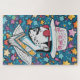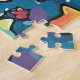 Dieses Rätsel zeigt eine farbenfrohe Vektorgrafik eines männlichen ikonischen Trendsetters mit modischem Outfit, schwarzem Haar und Bart, rosa Sonnenbrille und Blume dekorierten Hut. Das ist ein großes und herausforderndes Rätsel für Fashion-Rätsel.