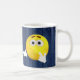 Trendy emoji Kaffee-Tasse in einem blauen hölzernen Hintergrund. Entwurf © durch Nayda Liz Rivera
