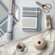 Modular Mitteljahrhundert Modernes geometrisches Muster in neutralem Blau Grau und Taupe Töne. Saubere quadratische Formen mit einer zeitgenössischen Mitte des Jahrhunderts modernen Vintagen Ästhetik. Einfaches, raffiniertes Design von Kierkegaard Design Studio.