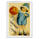 Vintage Halloween Grußkartenabbildungen zeigen ein Kind mit einer Jack o' Laterne.