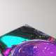 Mohawk Punk Rocker Frau mit farbenfrohen Mohawk, Tattoos und Piercings und abstraktem fließendem Kunsthintergrund in Schwarz, lila, Grün und Blau.