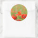 Runder Aufkleber der vibrierenden roten Mohnblumen-Blumen auf einem grünen Gebiet voll der Mohnblumen. Es hat ein starkes Gefühl von hapiness, von Frühling und von Sommer.