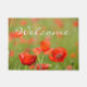 Türmatte mit vibrierenden roten Mohnblumen-Blumen auf einem grünen Gebiet voll der Mohnblumen. Es hat ein starkes Gefühl von hapiness, von Frühling und von Sommer. Es kommt mit dem Text: "Willkommen" im Weiß.