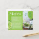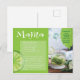Rezept Postkarte für das Mojito, ein traditionelles kubanisches Highball-Cocktailgetränk aus Rum, Minze und Limon. Die Karte enthält ein Foto einer Flasche, die in ein Glas mit Minze und Limon gießt, eine Grafik von Limonen Scheiben und Minzblättern und das Rezept.