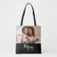 Being a mom is one of the most important jobs in the world. Show your favorite mom that you care with this custom, minimal photo tote bag. Simple white script calligraphy and sans serif typography, along with your personalized photo, overlay a black tote bag. Personalize with the photo of your choice and the mom “established” year date when your first child was born. Add additional years for each child. And switch out “mom”, if desired, for however you call your mom or mum.
