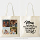 This beautiful canvas tote bag features a deeply sentimental quote, "mom, thanks for being the steady hand that guided me through it all," rendered in an elegant, modern brush script. The design incorporates a custom 4-photo collage layout, allowing you to curate a visual timeline or a collection of your most cherished shared moments. The clean, minimalist aesthetic ensures that your personal photography remains the focus, perfectly framed by the heartfelt typography.