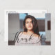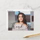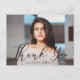 Stilvolle, elegante Abschluss Dankeschön-Karten mit einem modernen, schwarzen Kalligraphie-Script-Schriftart, der das Lieblings-Senior-Foto des Absolventen überragt. Personalisieren Sie den modernen Abschluss Dankkarten durch Hinzufügen des Namens, der Rücksendeadresse, und Ihrer eigenen Botschaft.