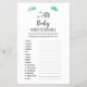 Dieses Mommy Baby Elephant mit Clouds "UK Baby Words Scramble" Spiel ist perfekt für eine Dschungelmassage Babydusche oder Sprinkle, für einen Jungen oder ein Mädchen. Das Design zeichnet sich durch ein Baby-Elefantenduo in Grau und aquamarin mit Polka Dotwolken und Kalligraphie aus. ANTWORTSCHLÜSSEL: 1. Tether, 2. Bassinette, 3. Formel, 4. Decke, 5. Bettwäsche, 6. Windeln, 7. mobil, 8. Flasche, 9. Dummy, 10. Gummiente, 11. gefülltes Tier, 12. Thermometer, 13. Hochstuhl, 14. Wickeltisch, 15. Kinderwagen —