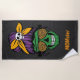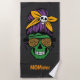 A stylish skull with a purple bun, leopard print sunglasses, and a skull-adorned bandana, perfect for Halloween enthusiasts with a flair for the dramatic.