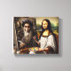 Eine einzigartige, spielerische Drehung auf dem berühmten Gemälde, in der Mona Lisa eine Palette und einen Pinsel zeigt, und das Portrait von da Vinci auf einem Sockel aktiv gemalt wird.