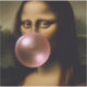 Eine lustige Darstellung der Mona Lisa, die ein rosa Kaugummi bläst