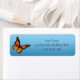 Ein schwarzer, orangefarbener und weißer Monarch Butterly vor einem blauen Hintergrund.