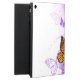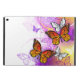 Orange, detailed monarch butterflies on light, purple, picture, painted background.