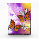 Orange, detailed monarch butterflies on light, purple, picture, painted background.