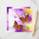 Orange, detailed monarch butterflies on light, purple, picturesque, painted background.