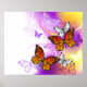 Orange, detailed monarch butterflies on light, purple, picture, painted background.